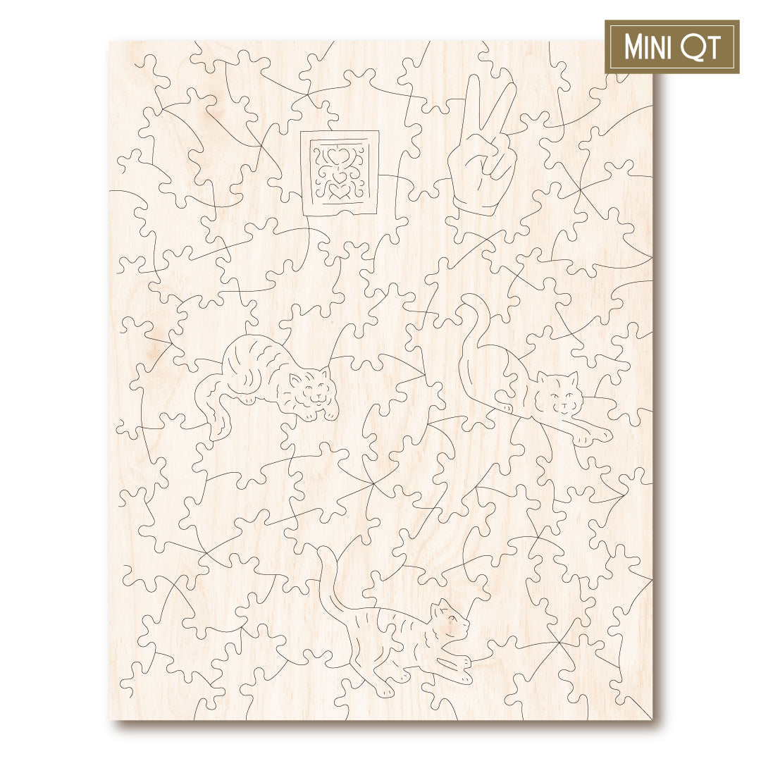 Our MINI QT puzzles are laser cut from thick, 4mm plywood and include 5 whimsies - they make a great puzzle snack!