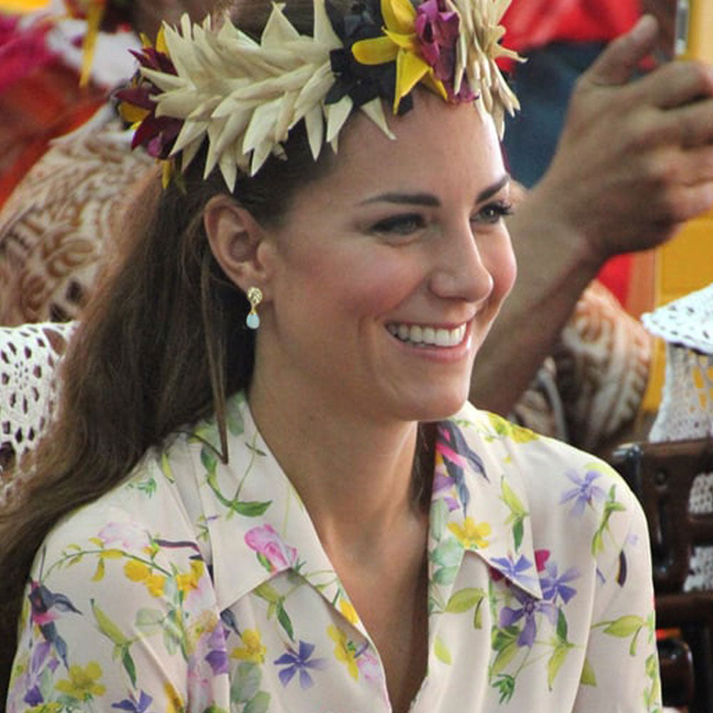 A vibrant colour alternative to the original Aqua Chalcedony drop stud earring, personally chosen and worn by Kate Middleton, The princess of Wales . A simple gemstone earring which gives a mighty pop of colour, transforming your look from classic to funky .