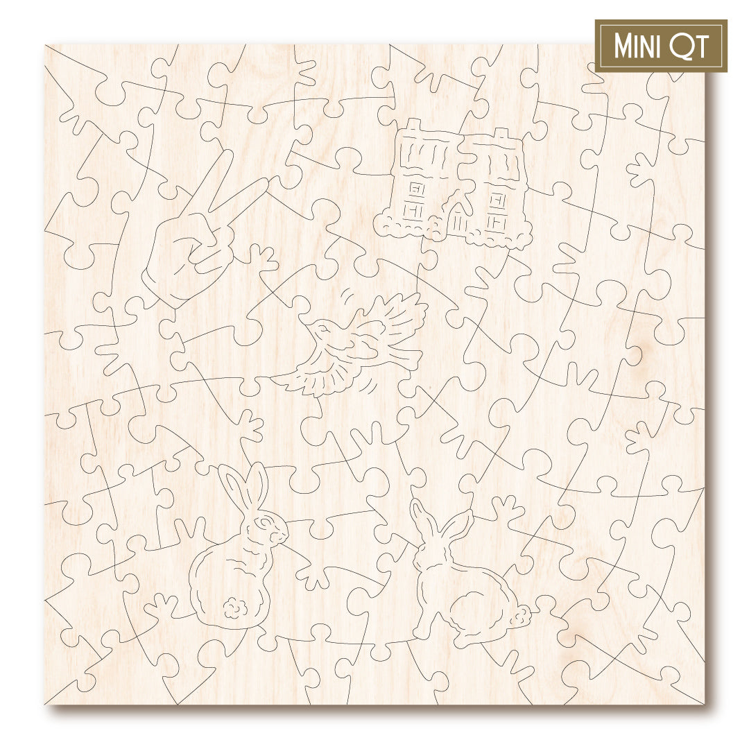 Our MINI QT puzzles are laser cut from thick, 4mm plywood and include 5 whimsies - they make a great puzzle snack!