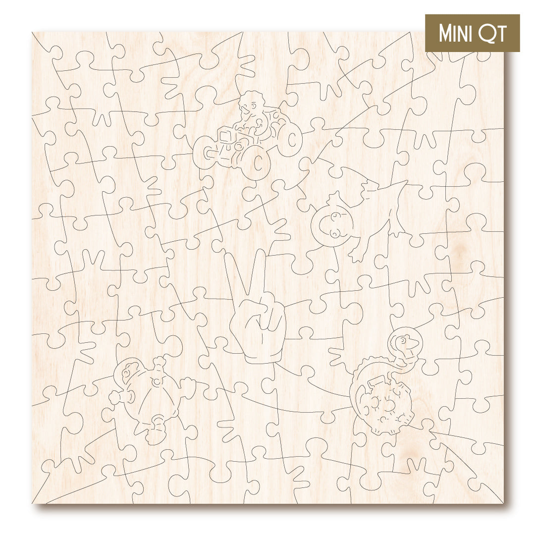 Our MINI QT puzzles are laser cut from thick, 4mm plywood and include 5 whimsies - they make a great puzzle snack!