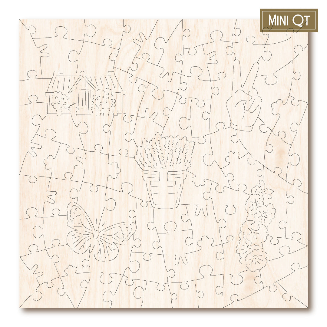 Our MINI QT puzzles are laser cut from thick, 4mm plywood and include 5 whimsies - they make a great puzzle snack!