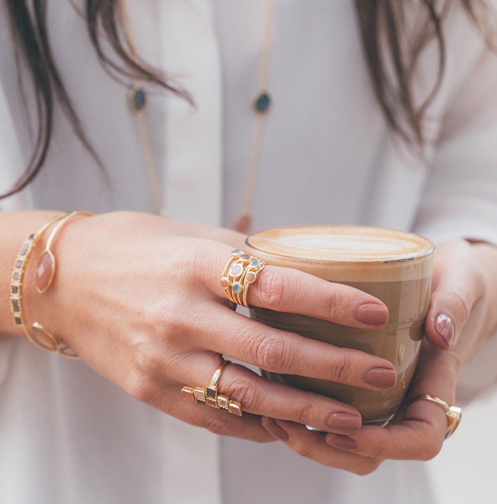 A beautifully entwined cocktail ring showcasing a harmonious mix of gemstones — Green Onyx, Amethyst, Moonstone, and Labradorite. Each stone brings its own character and subtle radiance, creating a design that feels both contemporary and timeless. Perfect as a statement piece for evenings out or to add a touch of elegance to your everyday look.