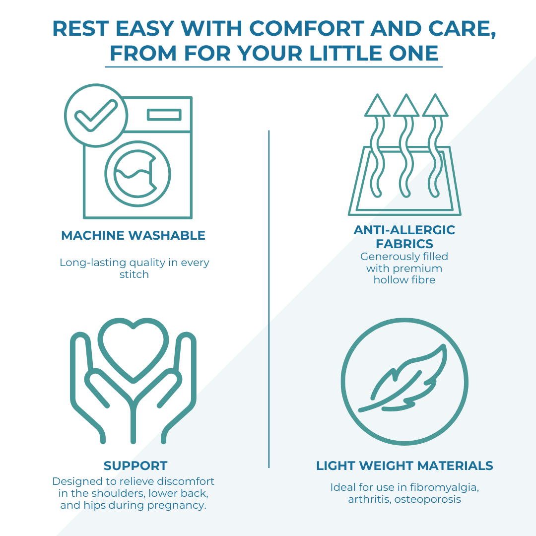 Experience unparalleled comfort during your pregnancy with the 12 Ft Maternity Pillow And Case - Coffee. This specially designed pillow from For Your Little One provides exceptional support for expecting mothers, ensuring a restful and peaceful sleep. Crafted from ultra-cosy, soft-to-touch fabric, this maternity pillow is your ultimate companion throughout your pregnancy journey. Featuring a generous 12 ft length, this maternity pillow allows you to find the perfect positioning for optimal comfort. It is especially beneficial for those suffering from fibromyalgia, arthritis, or osteoporosis, providing targeted support to alleviate discomfort and promote relaxation. The easy-to-carry pillow case allows you to take your maternity pillow with you wherever you go, ensuring uninterrupted comfort even while traveling. With its anti-allergenic material, this pillow is safe and suitable for all individuals, providing peace of mind during your pregnancy. An ideal cuddle companion for those sleepless nights, the maternity pillow helps in reducing shoulder, lower back or hip pain by providing optimum support to your muscles and spinal joints. It can be placed in a number of positions or bent to complement your sleep posture. The 12 ft. maternity pillow is ideal for use during pregnancy or after your little bundle of joy has arrived into the world, you can use this pillow to hold him/her close to your body when sleeping. It is filled with hollow fibre that provides ideal firmness to elevate your comfort. The 12 ft. pillow is suitable for those suffering from the arthritis fibromyalgia and osteoporosis pain. It also helps in reducing maternity discomforts like pelvic pain or SPD. This pain-relief pillow has been designed using anti-allergic fabrics so you won't have to worry about hurting your or your toddler's sensitive skin.