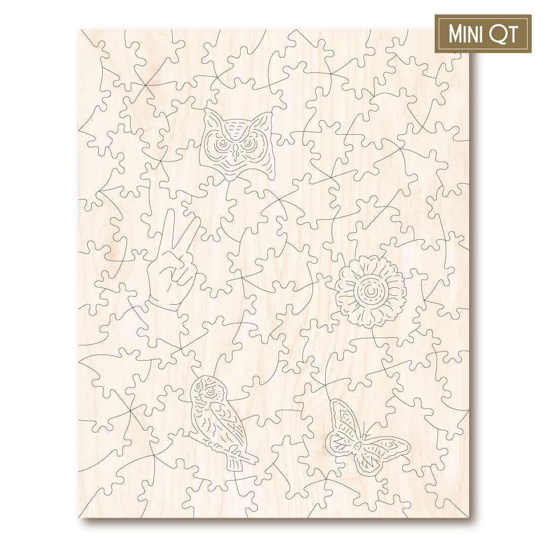Our MINI QT puzzles are laser cut from thick, 4mm plywood and include 5 whimsies - they make a great puzzle snack!