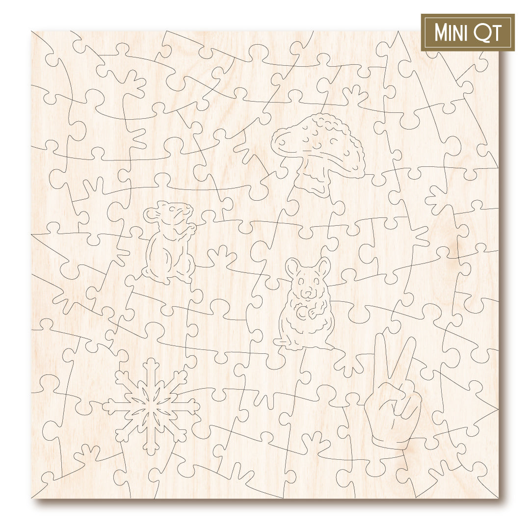 Our MINI QT puzzles are laser cut from thick, 4mm plywood and include 5 whimsies - they make a great puzzle snack!