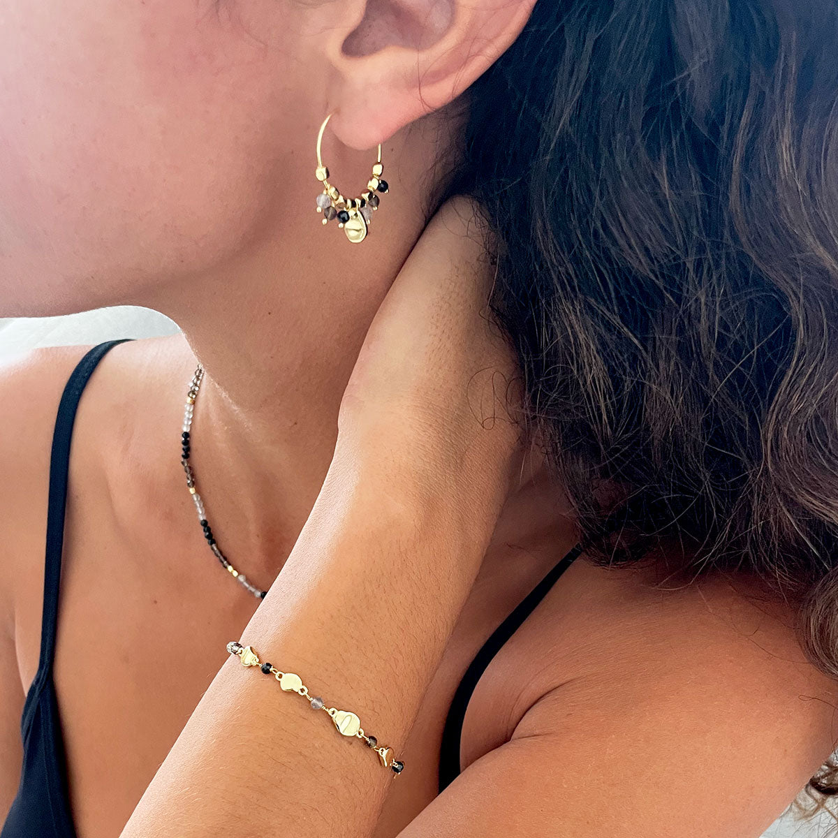 Enhance your outfit with a cool and captivating Sofia Gemstone and Gold Bead and Nugget Bracelet. Crafted with a gorgeous mix of gemstone and gold beads and gold nuggets, this bracelet adds a pop of shimmering colour to your wrist.