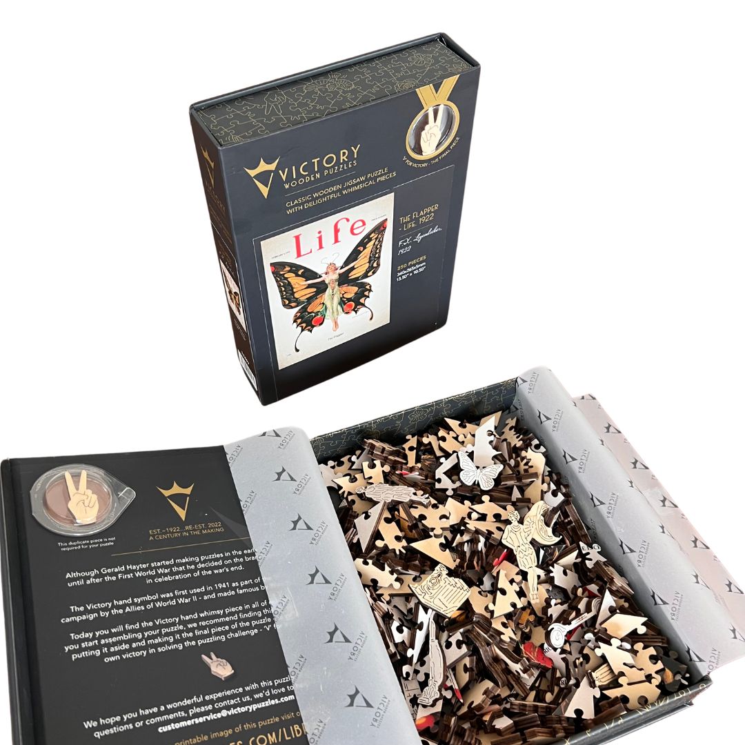 We chose this beautiful image because it was created in 1922, the same year that Gerald Hayter declared 'Victory' as the brand name for his wooden puzzles - it's our signature puzzle and features many cool 'whimsies' that were popular or invented around that time.