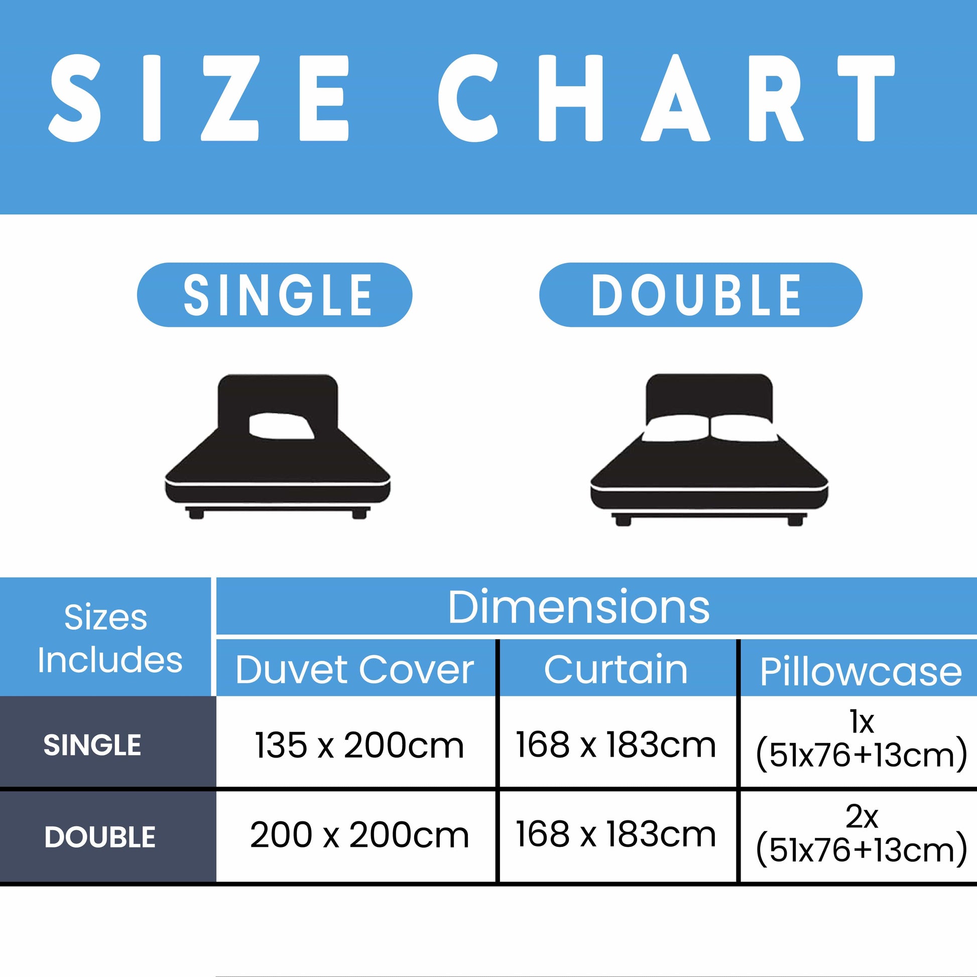 - Single: One duvet set (135 x 200 cm) + 1 pillowcase (48 x 74 + 13 cm)