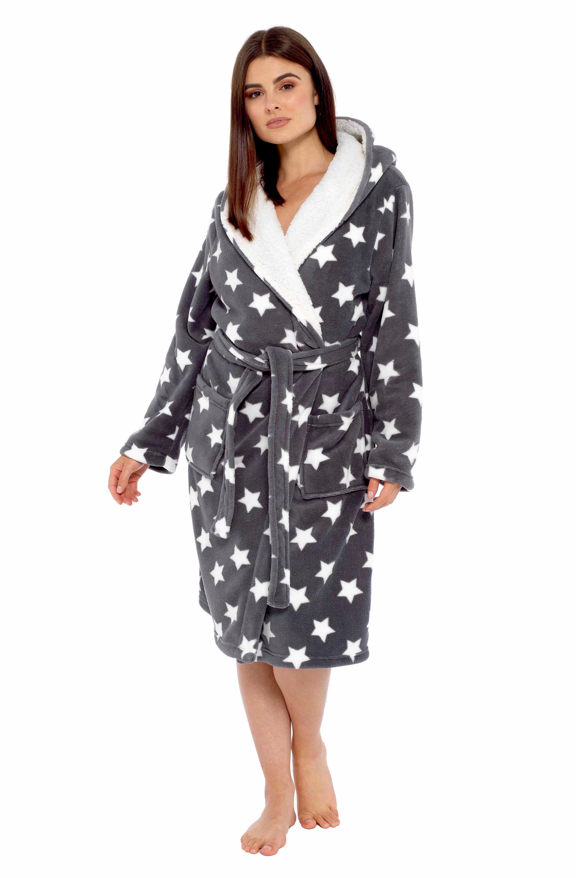 Women's Star Grey Hooded Plush Fleece Robe with Ultra Soft Sherpa Fur Lining and Stylish Star Pattern by Daisy Dreamer